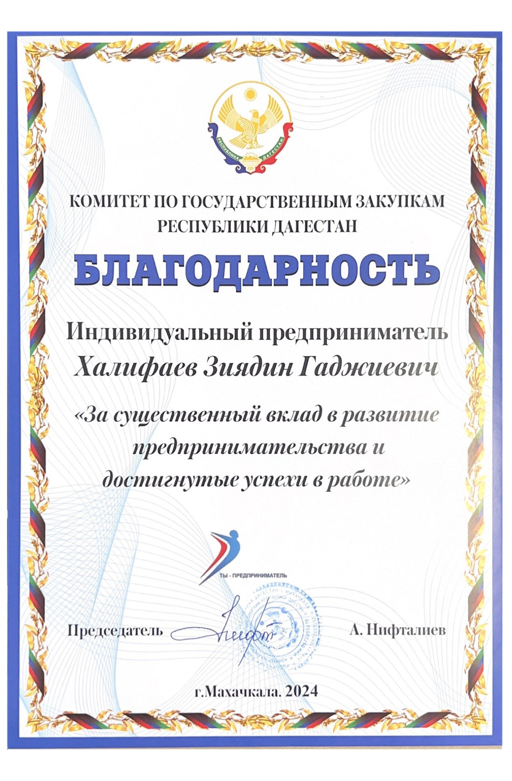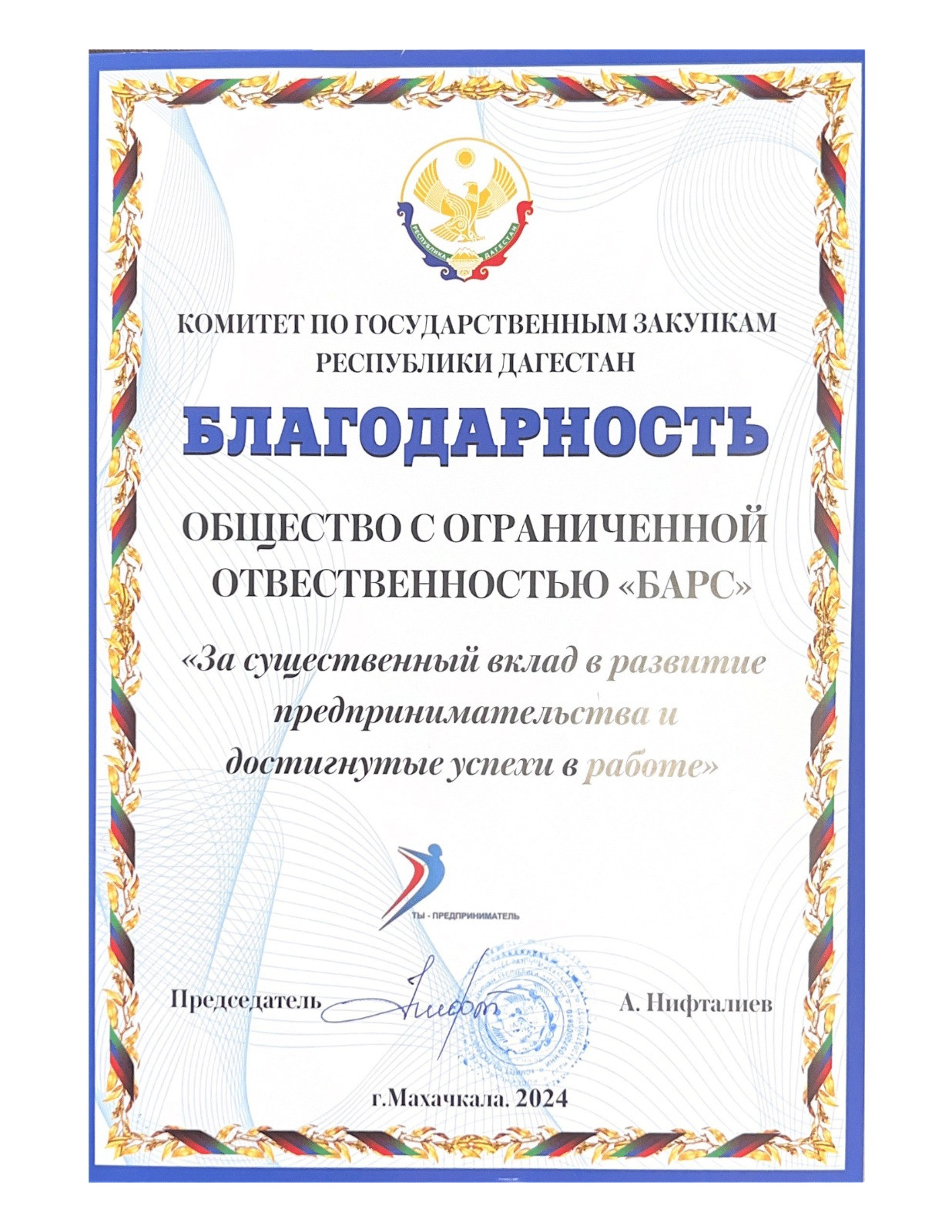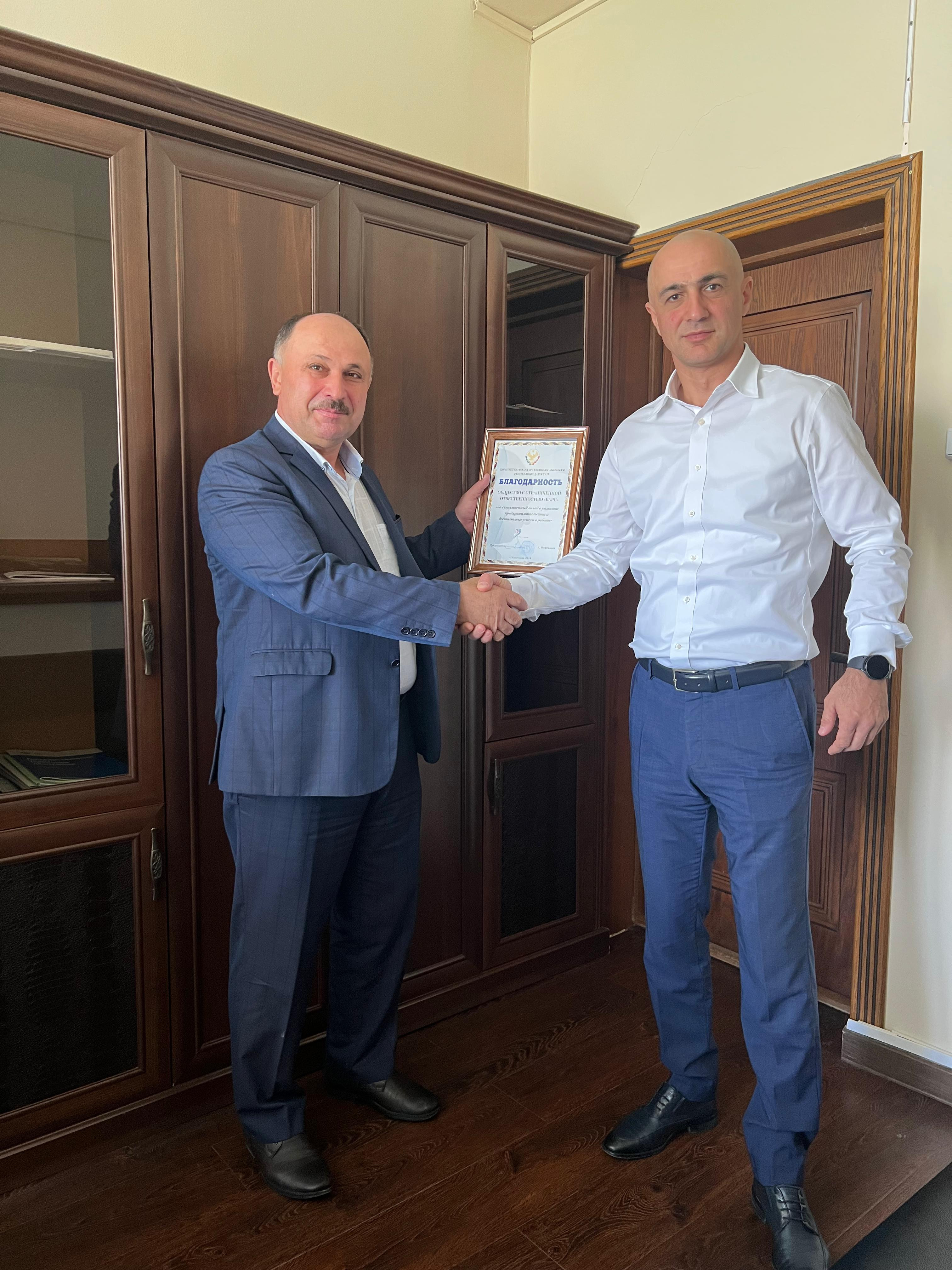 Руководство комитета по государственным закупкам Республики Дагестан вручило благодарственные письма региональным предпринимателям по итогам 2023 года.